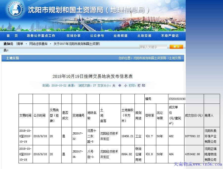 據(jù)沈陽市規(guī)劃和國土資源局10月22日公告,于今年10月8日至10月19日掛牌交易的沈西十二東路-5地塊、八號(hào)街-3地塊已成交,競得人分別為沈陽東泰環(huán)保產(chǎn)業(yè)有限公司、沈陽物流正瑞陸港物流有限公司,總面積約28.45萬平,規(guī)劃用途分別為工業(yè)用地、物流倉儲(chǔ)用地。